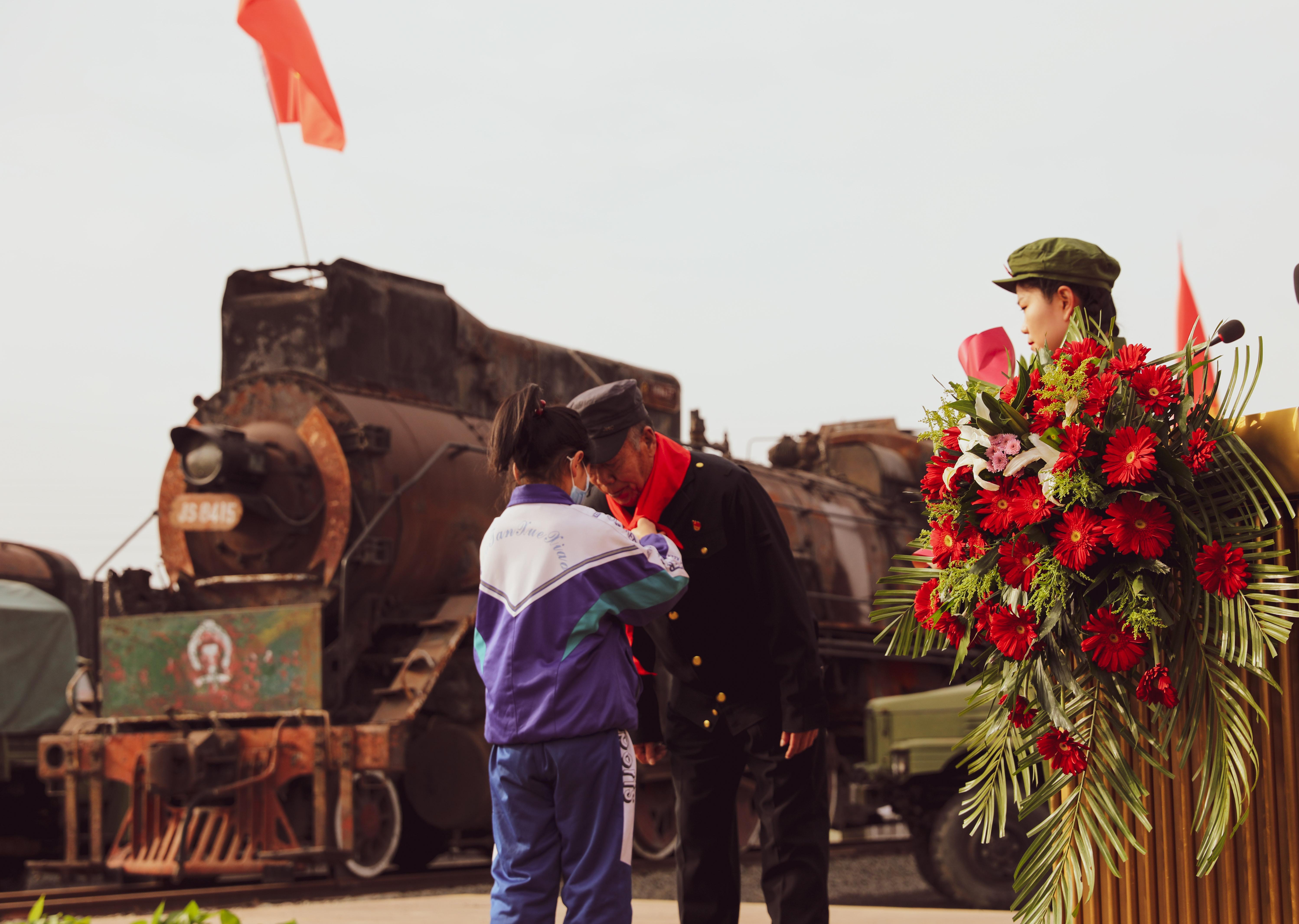雷鋒號第一任司機長張鳳武講述了他與雷鋒號的故事,學生代表為張鳳武佩戴紅領(lǐng)巾并獻上鮮花。